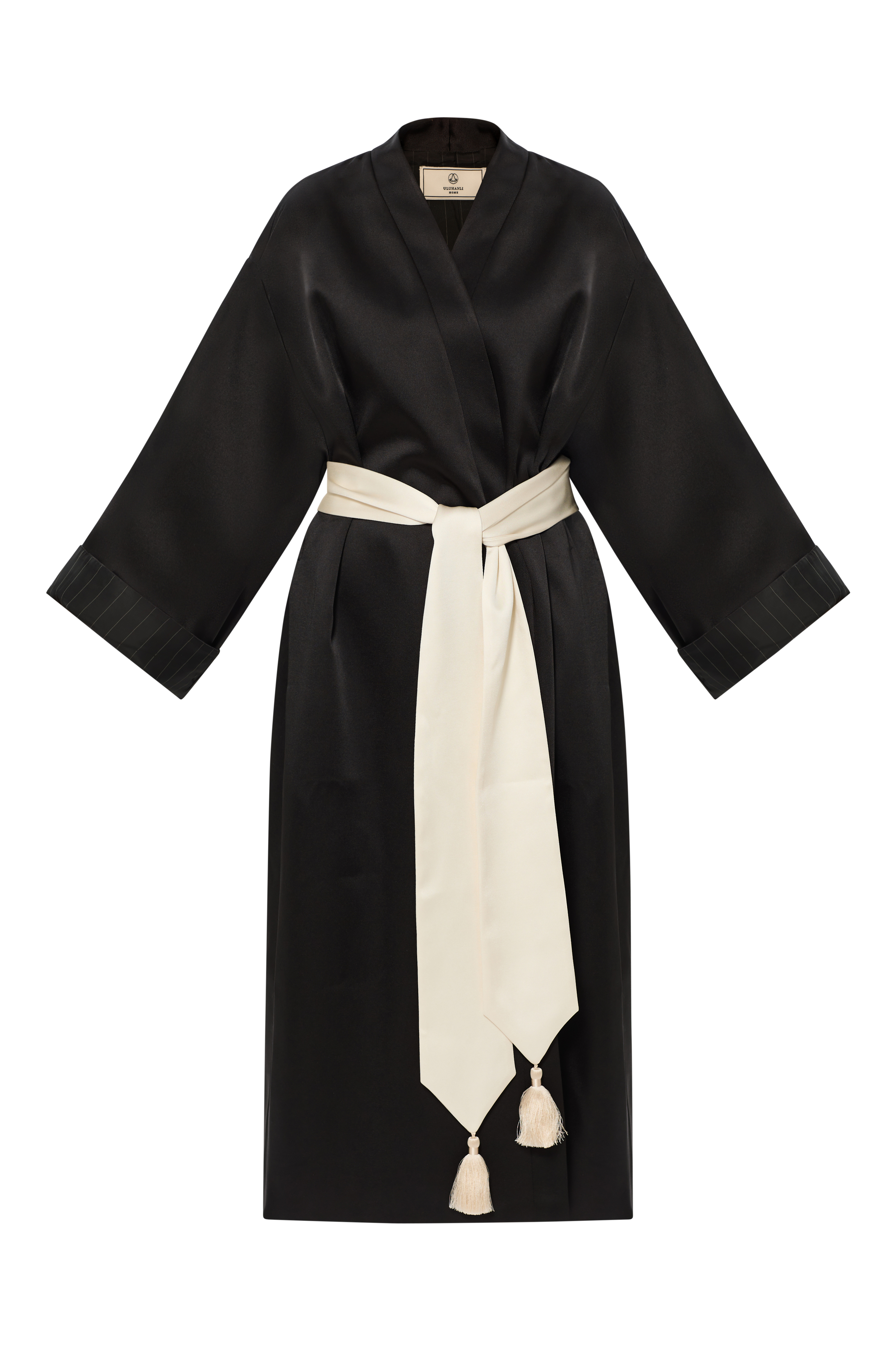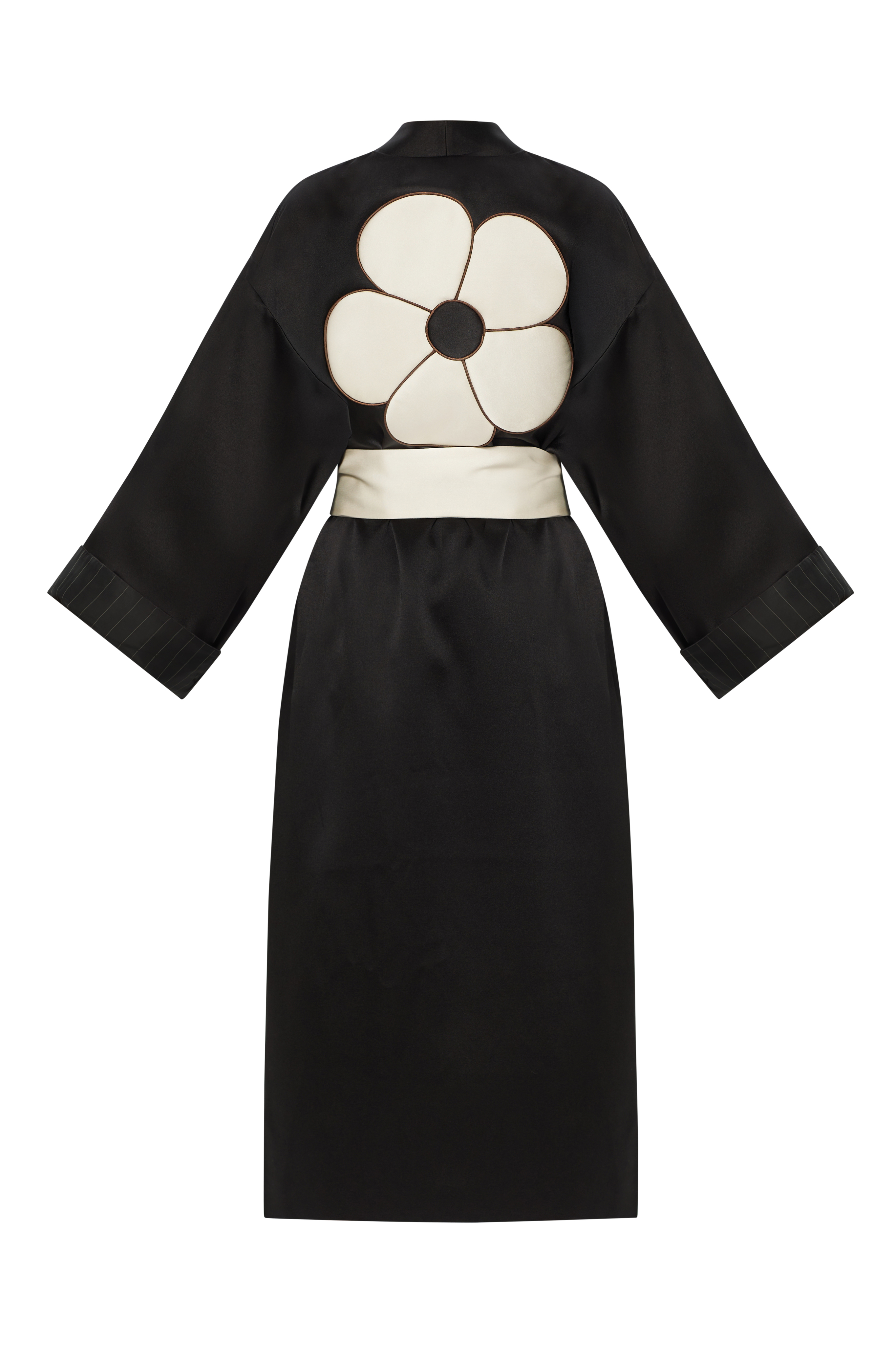 Материал: шелковый плотный дюшес c аппликацией в виде цветка на спинке изделия, на подкладке с боковыми карманами. Изделие с поясом, украшенными кистями.